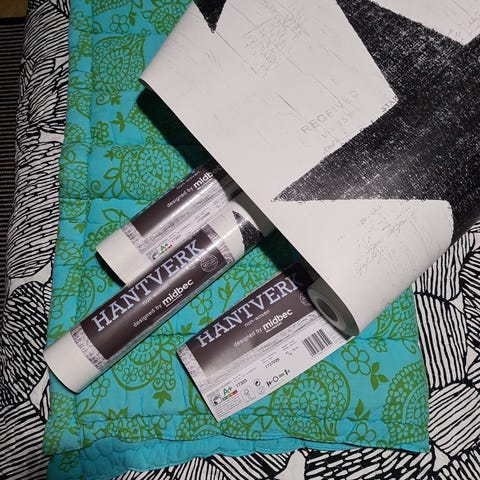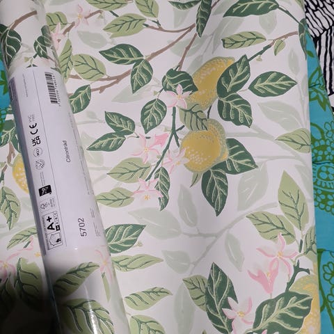 Midbec Skogsgläntan -tapetti, suunnittelija Hanna Wendelbo. Tapetissa on valkoisella pohjalla harmaa lehtikuvio. Rullan leveys on 53 cm. Soveltuu sisätilojen seinäpintojen tapetointiin kuivissa tiloissa valmistajan ohjeiden mukaisesti.