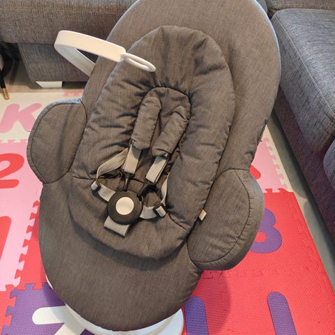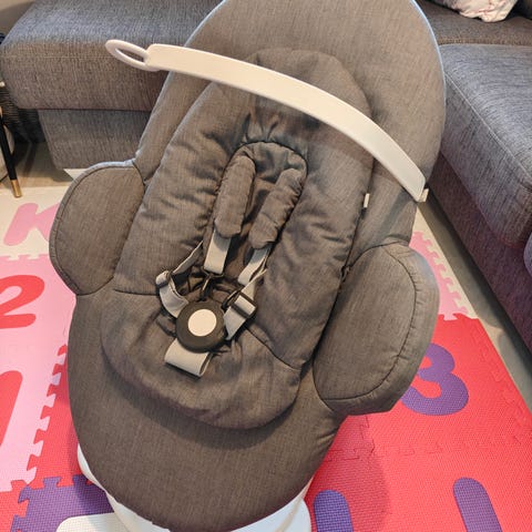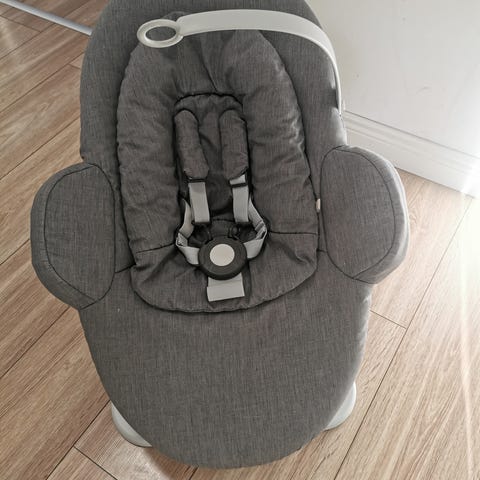 Stokke Steps Bouncer -sitteri harmaalla pehmusteella. Sitterissä on pehmeä, vauvalle muotoiltu istuinosa ja säädettävät viisipistevaljaat. Runko on vaalea, pehmusteet ovat irroitettavissa ja pestävät. Istuinosan kallistusta voi säätää takana sijaitsevasta säätimestä. Pehmeä jousto. Lelukaaren saa kiinnitettyä sitterin sivuun lelujen ripustamista varten. Mahdollisuus kiinnittää Stokke Steps tuoliin, tästä havainnekuva (HUOM! kuvassa näkyvä musta Steps -tuoli ei myynnissä). Erinomaisessa kunnossa ja toimii moitteetta. Ostettu v. 2023. Ovh. 139€.