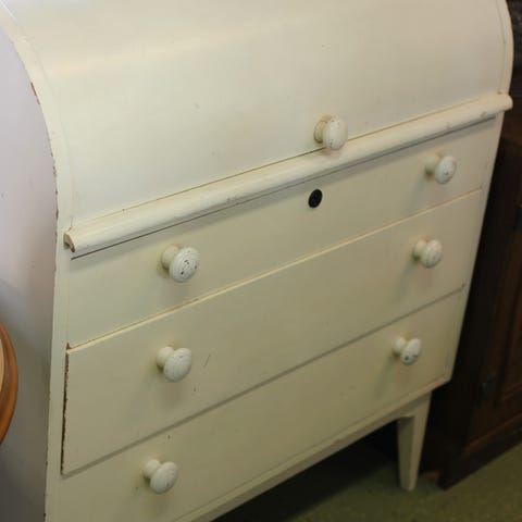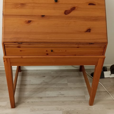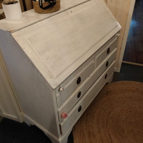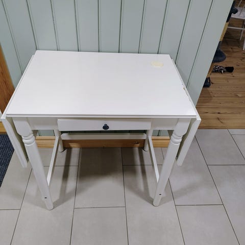 Klaffipöytä, jossa paljon laatikoita ja kaarevat jalat. Maalattu valkoiseksi värillä ”Jasmiini”, pöydän kannen pinta vähän kulunut.
