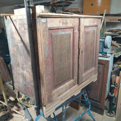 Myydään vanha ja koristeellinen kaappi joka on jykevää tekoa.