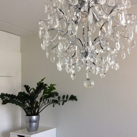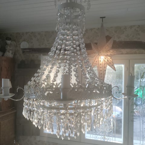 Kaunis kristallilamppu, paikat neljälle polttimolle, itsellä vain kaksi käytössä kun on sen verran kirkas.