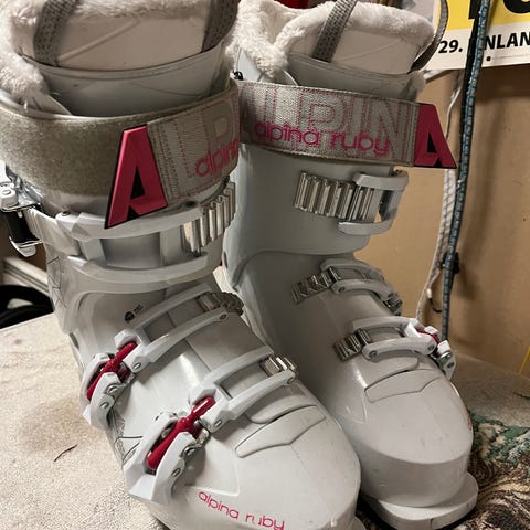 Lange laskettelumonot sininen. Neljä metallisolkea ja tarrakiristys varressa. Kovamuovinen kuori ja kumipohja. Sopivat rinnelaskuun ja yleiseen laskettelukäyttöön. Kulumajälkiä näkyvissä pinnassa kuvien mukaisesti.