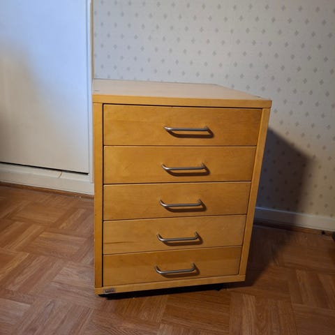 Kolmion mallinen laatikosto. Metalliset nupit irti, tallessa. Hiottu, voi maalata tai öljytä.