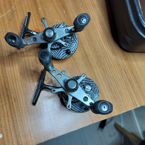 Myynnissä kaksi kappaletta vasenkätisiä Leofishingin liipasimellisia freefall pilkkikeloja. Kelat käyttämättömiä.