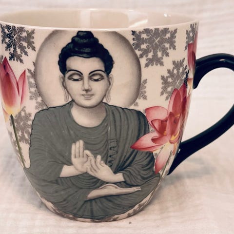 Indiskan xl-muki Lotus Buddha. Pieni muru puuttuu reunasta, näkyy kuvissa.
