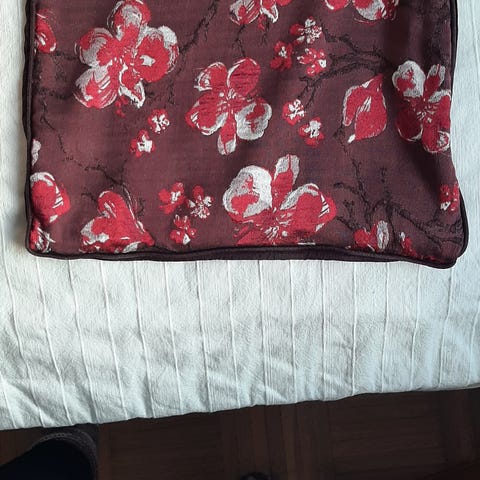 Tyynynpäällinen. Materiaali keinokuitua, konekirjottu. Vetoketjullinen.