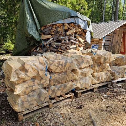 Vähän koivua säkissä. Löytyy metristä koivua pinosta. Kuljetus pienissä erissä.
