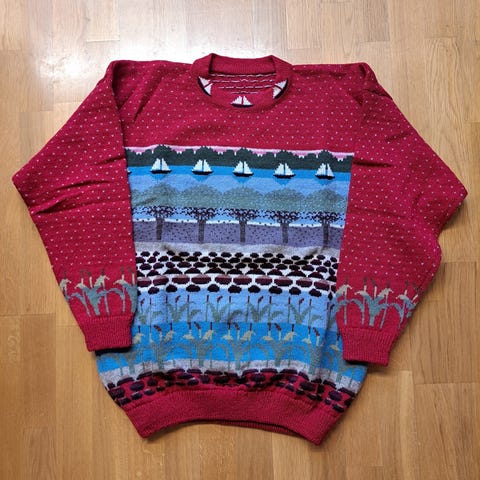 Marjapuuronpunainen eka itsekutomani kirjoneule 80-luvun lopulta. Käytössä ollut. Lanka oli jokin K ryhmän lanka, nimeä en muista. Ilmeisesti sisältää villaa, määrää en muista. Ilmoitan jos saan selville koostumuksen myöhemmin. Arviolta L kokoa, katso mitat. Kai-kai 50 cm, olka-helma 66,5. Savupiippukauluksen juuresta 63,5 cm hihansuuhun. Kuvassa on pieni reikäkohta joka johtuu valk. langan huonosta päättelystä. Ostaja saa sen mieleisellään tyylillä korjattua. Hinta 30€+pm