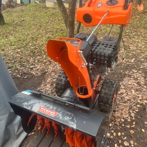 Todella kätevä käyttää, tehokas, iso, jykevä lumilinko, jolla lumi lentää kauas. Vedon vapautukset molemmilla puolilla helpottaa kääntymistä, syöksy torven ohjaus joystickilla, sähköstartti jne.