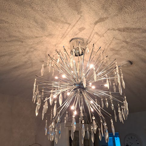 Myyydään Turun Kristallin kattoplafondi kahdeksalla polttimolla. Halkaisija 50 cm. Pieni ruuvi yläkuvusta (pitää kupua ylhäällä pistorasian suojana) puuttuu. Hinta 190€,