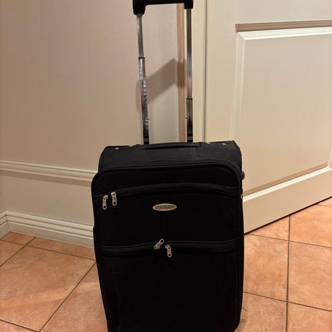 Vanha tilava matkalaukku reissussa vähän osumaa saanut. Laukussa irrallinen välipohja. Vetokahva, pyörät vain toisessa päässä.