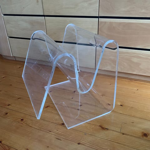 Lehtiteline, saa taitettua kasaan. Värissä kulumaa, mutta yleisilme siisti.