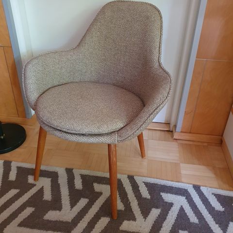 Tyylikäs Prinssi nojatuoli, design Carl Gustav Hiort af Ornäs. Suunniteltu vuonna 1948, tämä tuoli edustaa 50-luvun muotoilua, jossa on kaunis kukkakuvioinen, silkkiverhoilu. Tuolin runko on puuta, ja siinä on mukavat käsinojat, jotka tukevat hyvin istumista. Tuolissa on näkyvissä vain hieman kulumaa puuosissa. Kangas on hyvässä kunnossa, mutta siinä on joitakin käytön jälkiä.