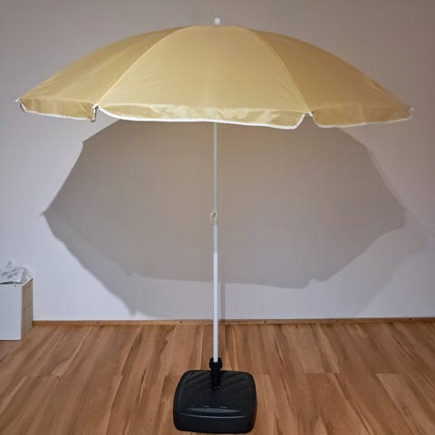 Varjossa on havaittavissa käytön jälkiä, kuten pieniä tahroja kankaassa ja kulumaa metalliosissa. Mekanismi toimii kuitenkin moitteettomasti, ja varjo on edelleen täysin käyttökelpoinen.
