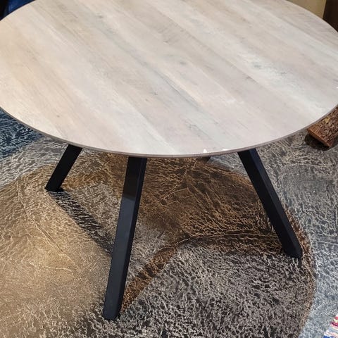 Hakusanat: pöytä, pöydät, sohvapöytä, ruokapöytä, taso, metallijalka, huonekalu, huonekalut, Valmistaja, pyöreä pöytä, kinnarps, moderni retro, käytetyt huonekalut, puunvärinen, asto