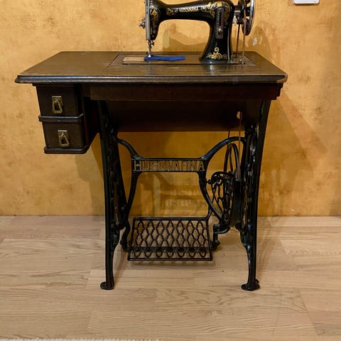 Hakusanat: puu, vintage, käsityö, patina, ompelu, metallijalka, koristeellinen, husqvarna, ruoste, klassinen, Valmistaja, ompelukonepöytä, 1900-luku, vintage huonekalut, hihna puuttuu
