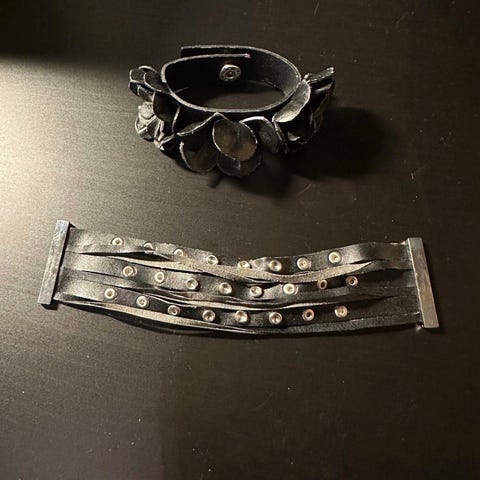 Mustat keinonahkaiset rannekorut 2kpl, toisessa kolme ruusukkeita, toisessa nappikiinnitys ja toisessa magneettikiinnitys. H&M.