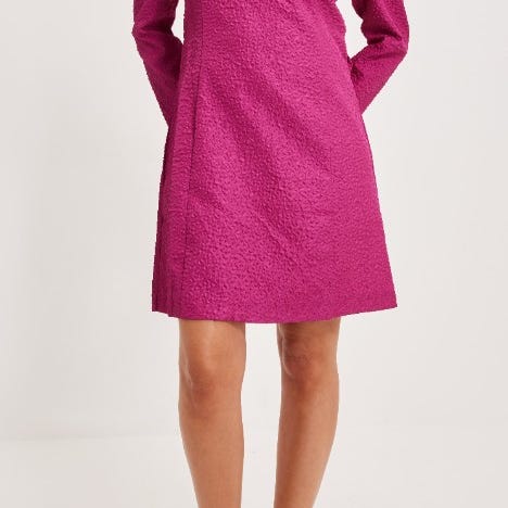 Mekossa kaulukset, napitus edessä. Korostettu vyötärö, 7/8 hihat.