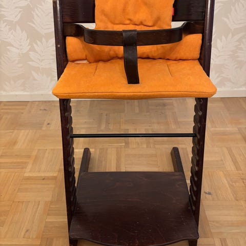0-11-vuotiaalla käytössä ollut lasten tuoli puinen ruskea, säädettävä istuin- ja jalkataso. Tuoli soveltuu eri-ikäisille lapsille, sillä istuimen ja jalkalevyn korkeutta voi muuttaa lapsen pituuden mukaan.