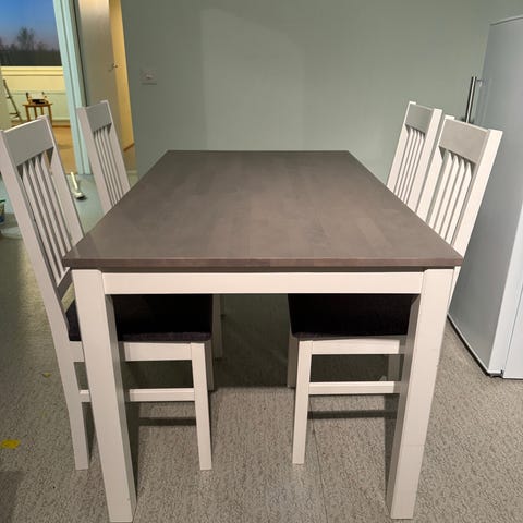 Umpipuuta, ei mitään lastulevyä. Niin tuolit kun pöydän runkokin. Koko 80cm x 120xm kork. 73cm On tukevat ja kestää varmasti pitkään. Pöytä on purettu kuljetuksen vuoksi, kaikki osat tallessa.