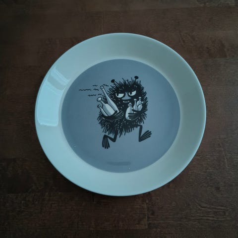Muumi lautanen Mörkö, halkaisija 19cm. Valosta aiheutuvaa heijastumaa kuvassa. Valmista 2005-2007.