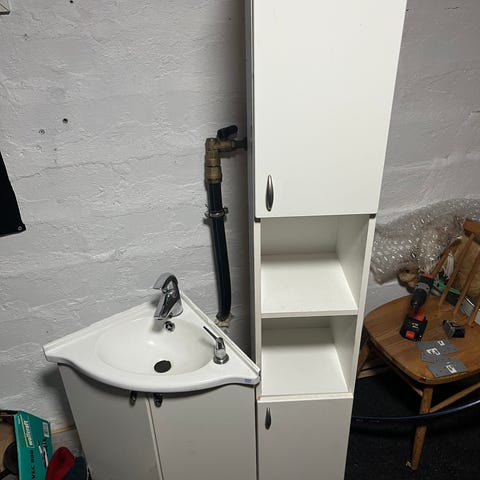 Pieneen tilaan pieni kulma lavuaari. Kylppäri kaappi myös kaupan ja saa samaan hintaan mukaan. Lavuaarin mitat 45cmx45cmx63cm