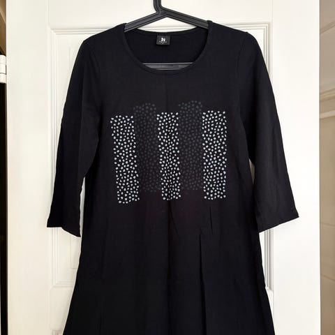 Uudenveroinen trikootunika. 95% viskoosia ja 5% elastaania. Pituus olalta helmaan 81cm. Rinnan ympärys 104cm. Ohuehko trikoo. Aavistuksen A linjainen. Kulkeutuu postissa pikkupaketissa 5,9e