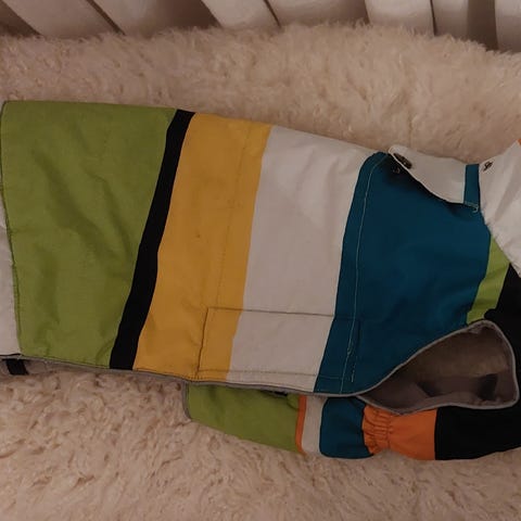 Rukka Bille Beino koiran takki keltaisena. Vetoketjulla suljettava malli, jossa selkäpuolella painatukset. Koko 40
