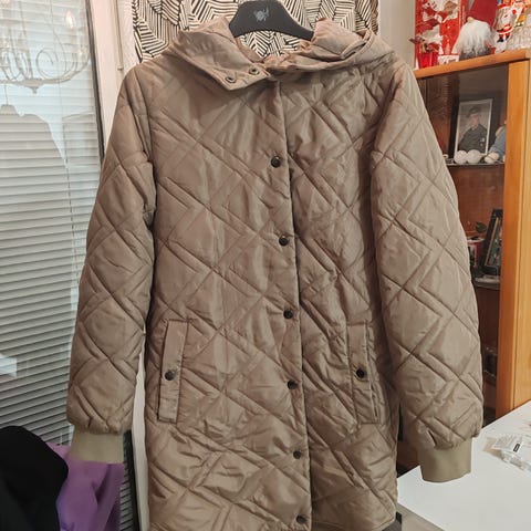 Vila pitkä takki naisille, koko 36. Väri tummanpunainen. Takin pinta on tikattu vinoruutukuviolla. Edessä on vetoketjukiinnitys ja sivuilla taskut. Helma on takaa hieman pidempi kuin edestä. Sopii arkipukeutumiseen viileämpiin keleihin.