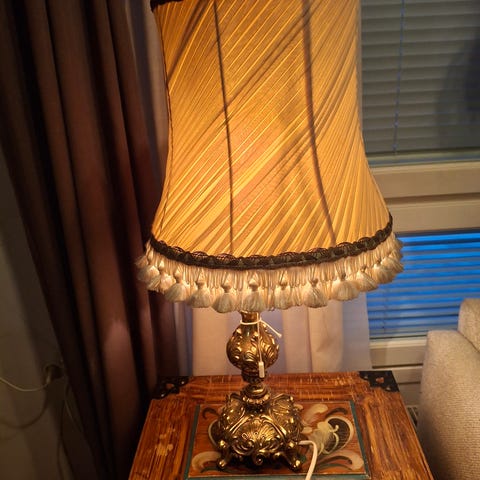Myydään alkuperäisessä kunnossa oleva vintage pöytävalaisin, kullanvärinen varjostin jossa jonkin verran jälkiä, kaunis messinki jalka, ja siinä kaksi "timanttia " kaunis valaisin, korkeus 55cm, 45€, Kemi, toimitus vain smartpostilla
