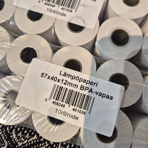 Hakusanat: lämpöpaperi, thermal paper, kuittipaperi, receipt paper, kassapaperi, kassakonepaperi, pos paper, lämpötulostin, thermal printer, tulostinpaperi, paperirulla, paper rolls, kassajärjestelmä, maksupääte, payment terminal, kuittirulla, atm paper, etikettitulostin, label printer, viivakoodi, barcode printing, toimistotarvikkeet, office supplies, yrityskäyttö, shop supplies, retail supplies, varastokäyttö, logistiikka, uusi paperi, käyttämätön, bulk, erä