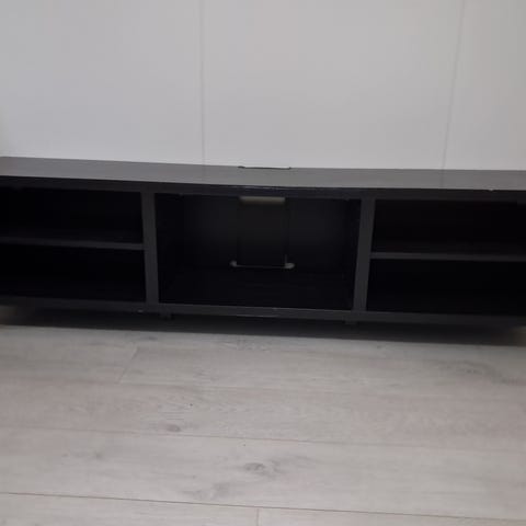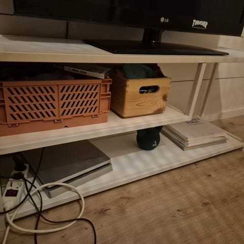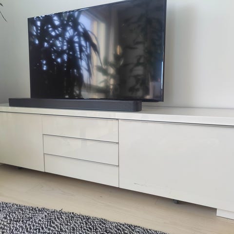 Ikean Brimnes tv-taso kahdella vetolaatikolla. Käytönjälkeä on, mutta päällisin puolin siisti.