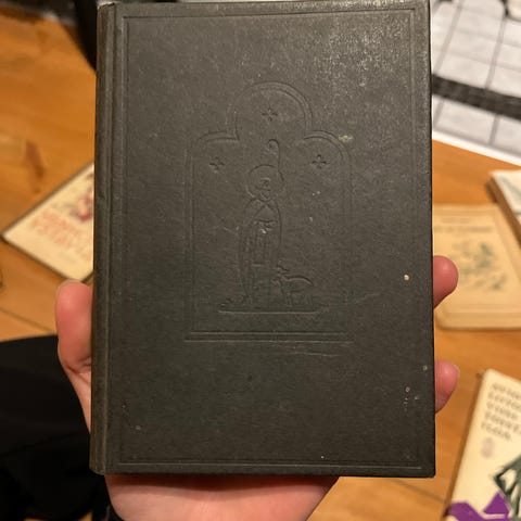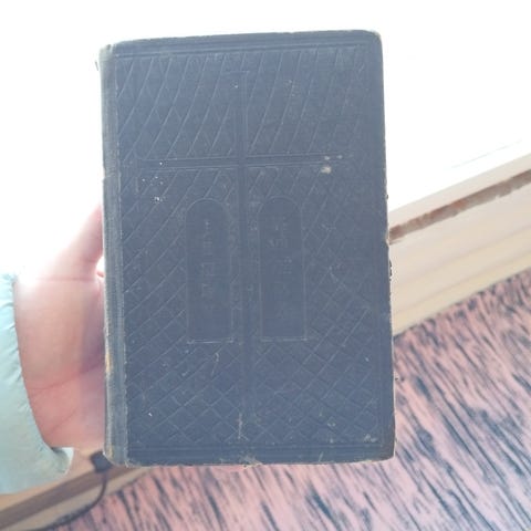 Käytössä kulunut vanha Raamattu. Joku lapsi piirrellyt sivun seiniin, ohessa kuvat. Sisällä omistuskirjoitus ja jonkun suvun tarinaa.