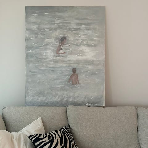 Iso Maalaus, jossa on vihreä tausta ja keskellä hahmo raidallisessa sinivalkoisessa asussa. Hahmolla on kädet ylhäällä ja käsissä tarjottimet, joilla on viinilaseja. Teos sopii sisustuselementiksi seinälle esimerkiksi olohuoneeseen tai ruokailutilaan