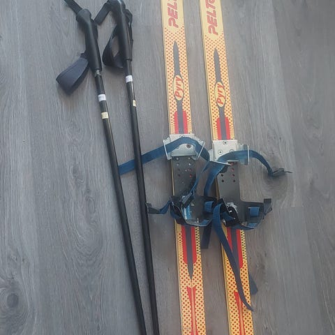 Vain muutama kerran hiihdetty, viime vuonna ostetut sukset, sauvat, monot ja pidikkeet. Monon koko 28, sukset 120