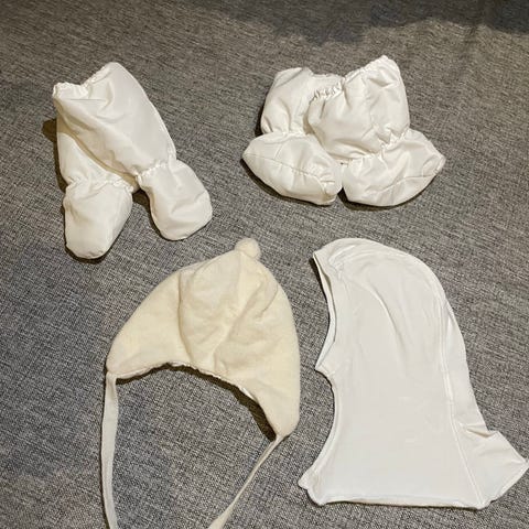 Äitiyspakkaus v 2022 vauvan kypärämyssy, tumput, töppöset ja pipo. Kaikki ehjät, tahrattomat ja hajuttomat.