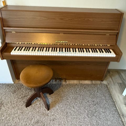 Hellas pystypiano ruskealla puuviilupinnalla. Soittimessa on täysikokoinen koskettimisto ja kaksi poljinta. Puuviilupinta jatkuu kauttaaltaan rungossa, ja pianossa on suljettava koskettimien kansi. Soveltuu akustiseksi pianoksi kotiin tai harjoittelukäyttöön.