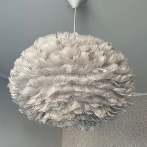 Vaaleanruskeassa varjostimessa on 4500kpl hanhen höyheniä, se on kaunis, yksilöllinen ja uniikki. Varjostimen halkaisija on 65cm ja korkeus 40cm, sopii myös kattovalaisimeksi.