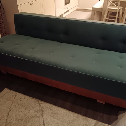 Värinä turkoosi, joka on ajan mittaan hieman haalistunut, mutta näyttää edelleen hyvältä. Vuodeosan patja on ohut, mutta kyllä sillä yhden yön nukkuu. Tukeva ja painava.
