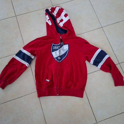 Lasten vihreä pelipaitahuppari, keltamustilla raidoilla ja isolla Ilveksen logolla. Edessä avoin iso tasku.