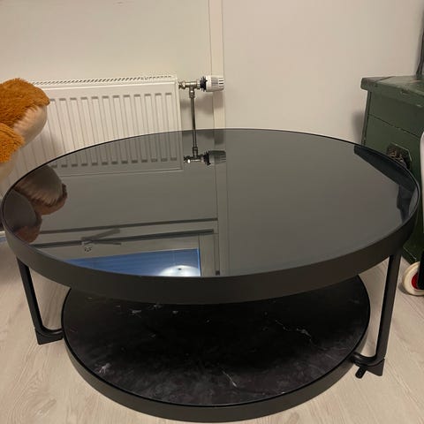 Pöydän alla on lasinen välitaso, joka ulottuu molemmille puolille pöytää – kätevä säilytykseen esimerkiksi lehdille tai kirjoille.