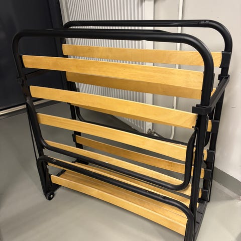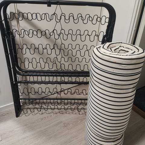 Teräs. 7 cm paksu polyeetterivaahtomuovipatja. Puinen sälepohja. Kokoontaitettava. L80 x P190 x K33 cm