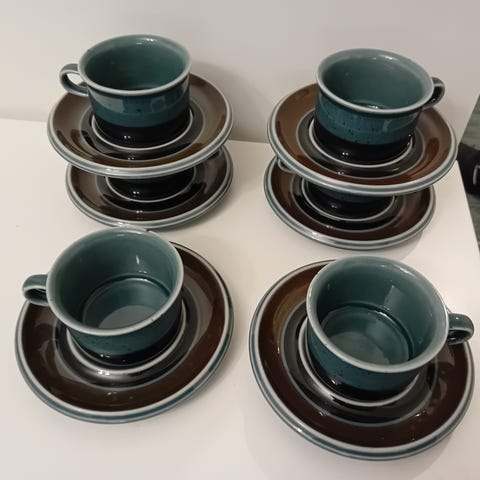 Arabia Mekka mokkakupit 3 kpl, 15 €/kuppi ja lautanen, yhteensä 40 €