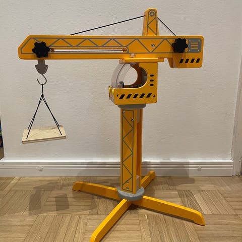 Hapen puinen nosturi. Narusysteemiä vähän korjattu ja hytti vähän on huojuva mutta oikein siisti ja toimiva seuraavalle leikkijälle. Mukaan tulee myös puinen kuorma-auto