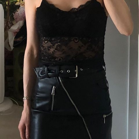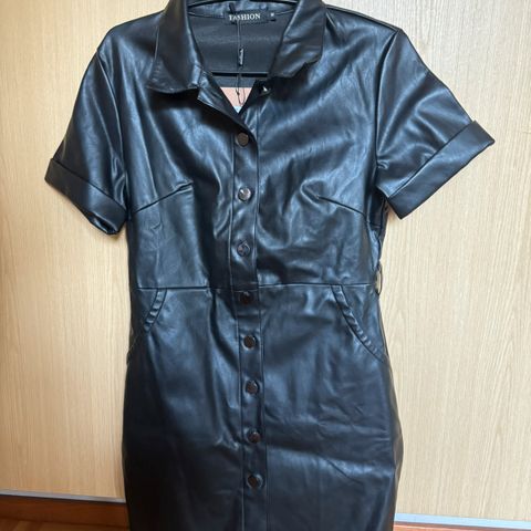 Hyväkuntoinen musta midimekko tekonahkaisella alaosalla.