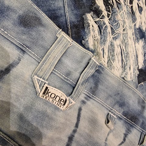 KoneHelsinki farkut miehille. Koko W32/33, miesten koko L. Väri musta / tummansininen denim, jossa useita erisävyisiä farkkukangaspaneeleja edessä ja takana. Materiaali denim. Housuissa vetoketjukiinnitys edessä, vyölenkit ja useita taskuja. Sopivat arkikäyttöön ja vapaa-aikaan.