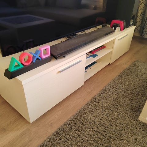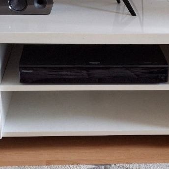 Kiiltävä valkoinen Jyskin tv-taso. Hyvässä kunnossa. Yksi pieni kolhu etuosassa, jota ei huomaa kauempaa. Lisäksi takalevyyn tehty reikä johdoille.