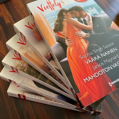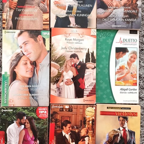 Harlequin romaanipaketti sisältää useita pokkarikokoisia rakkausromaaneja suomen kielellä. Kirjat ovat pehmeäkantisia, jossa yhdessä niteessä on kaksi eri romaania. Sopii luettavaksi esimerkiksi kevyenä viihteenä ja ajankuluksi. Paketti sisältää kuusi kappaletta uusia pokkareita. Myydään mielellään kerralla. Kuusi euroa koko setti.