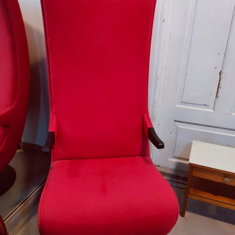 Kääntyvä nojatuoli, jossa korkea selkänoja ja käsinojat. Verhoiluna harmaa kangas. Runko ja jalusta ovat metallia, ristikkomallinen jalusta mahdollistaa tuolin kääntymisen. Selkänojassa on pyöreä metallinen yksityiskohta yläosassa. Soveltuu esimerkiksi olohuoneeseen tai työtilaan istuimeksi.