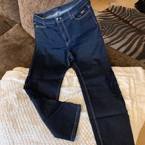 Koko: 5 , 42 ( vyötärön leveys 45 cm , ei jousta , vyötärö-haara 28 cm , lantion leveys 54 cm , joustaa n. 60 cm asti , haara-lahje 77 cm , vyötärö-lahje 105 cm ja lahkeensuun leveys 26 cm )